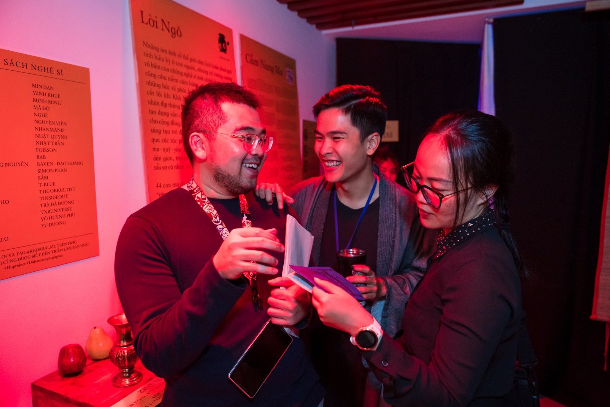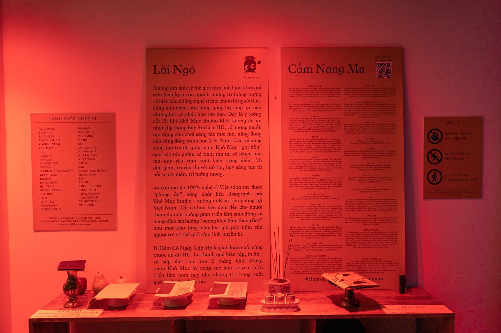 Triển lãm phòng tối “Đi Đêm Có Ngày Gặp Ma” (tháng 9.2020) là kết quả của quá trình giám tuyển biên tập sau 2 tháng khởi động dự án.Các tác phẩm được in bằng mực riso hồng phản quang. Mỗi khách tham quan được phát cho một đèn UV tím để soi tranh tìm ma trong phòng triển lãm tối đen.